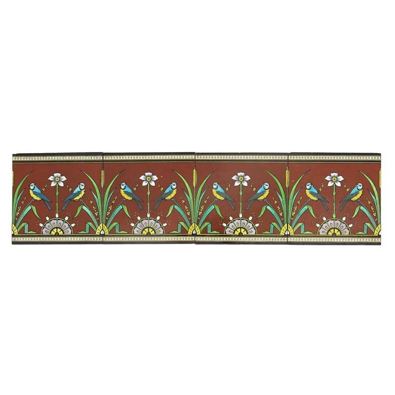 Four Minton's dust pressed tiles designed by Dr Christopher Dresser, each printed and painted with blue tits perched on grasses, flanking a central flower stem, in colours on a brown ground, impressed factory marks, repair to corner of one, 20.5cm. square, (4)