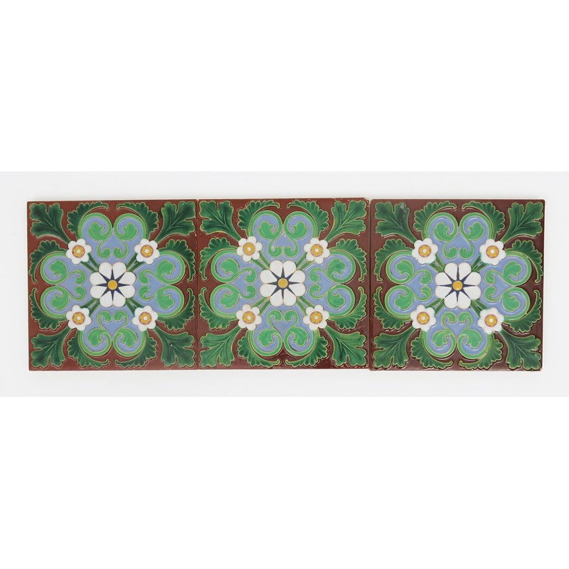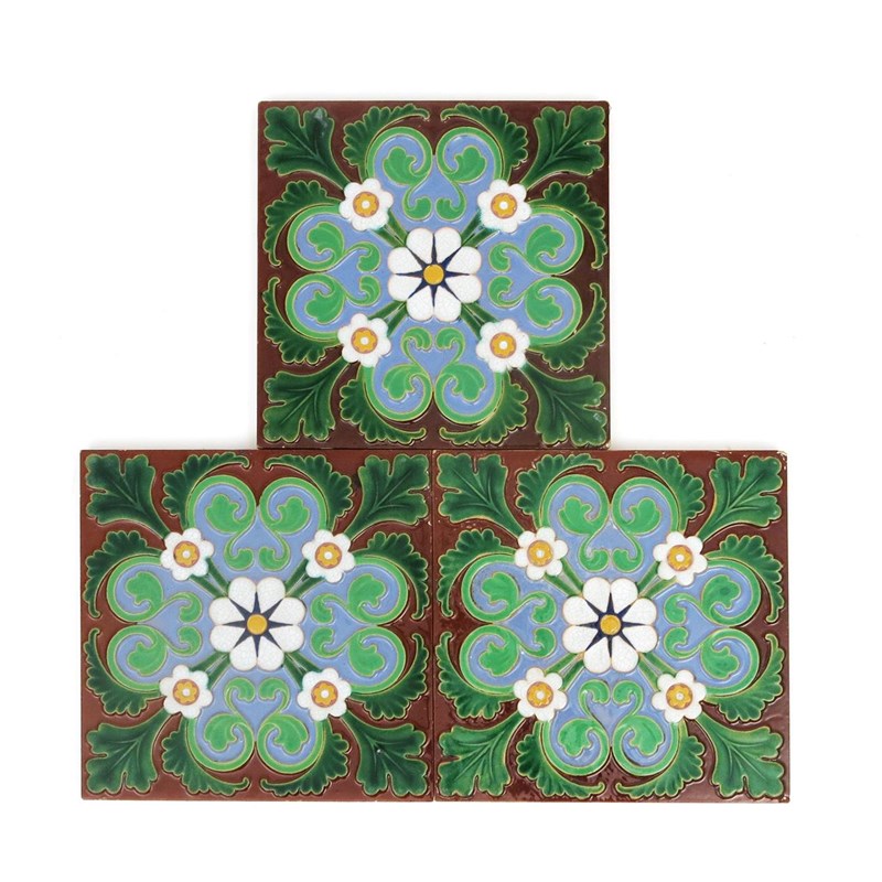 A set of Minton Hollins & Co tiles in the manner of John Pollard Seddon, cast in low relief with a central flowerhead and radiating flowers and foliage, glazed blue, green and white on a terracotta ground, impressed marks, 15cm. square (3)