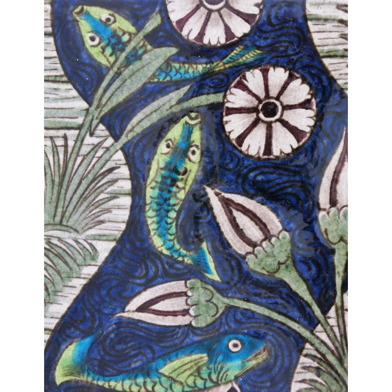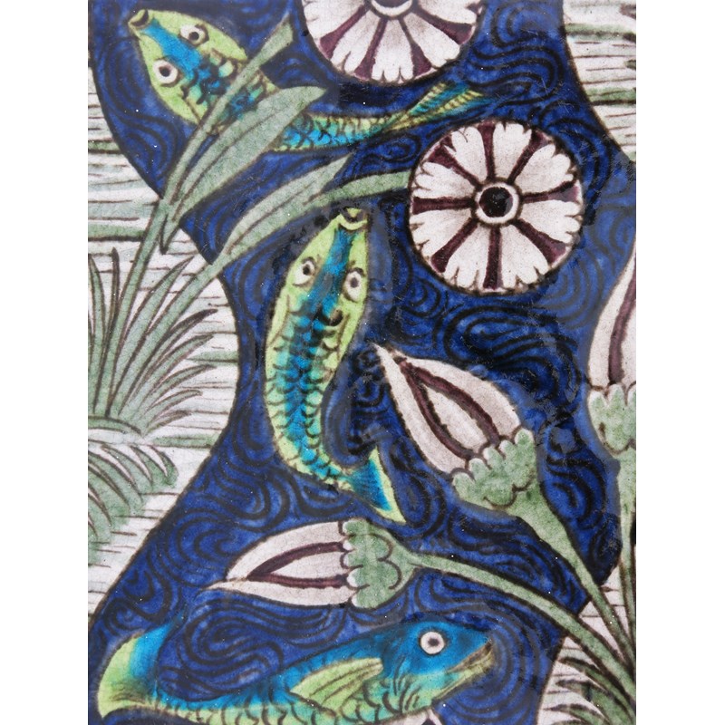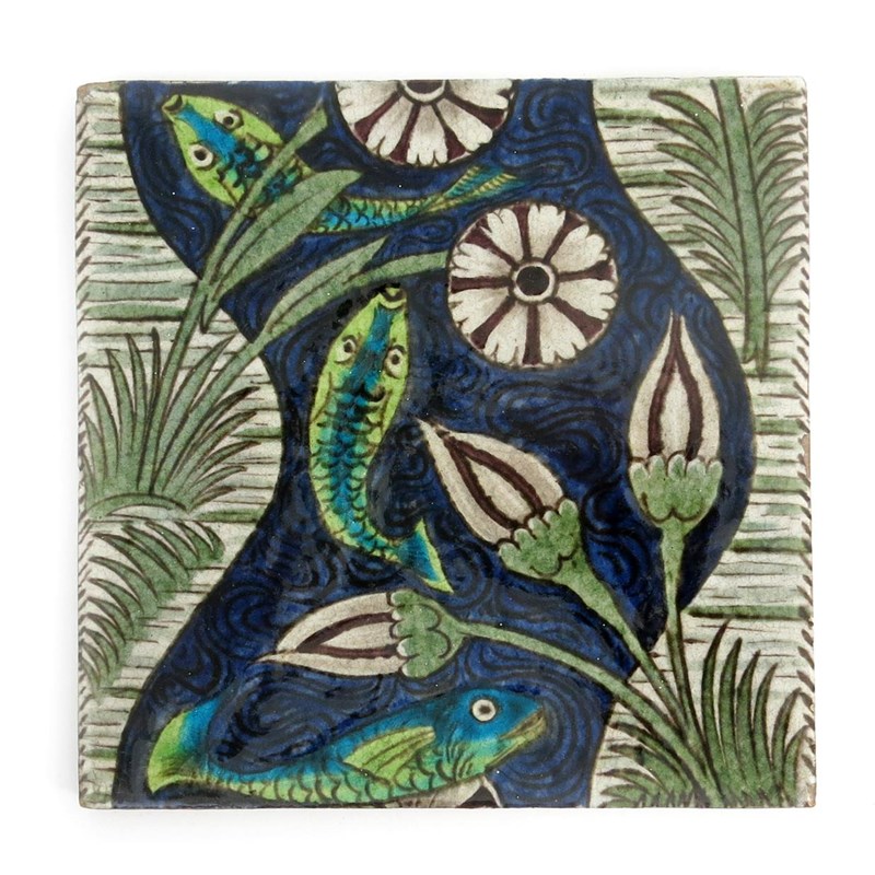 A William De Morgan Merton Abbey tile, painted with fish swimming along a meandering river, with tulip flowers on the banks, painted in shades of blue, turquoise and aubergine on a cream ground, impressed mark, minor glaze frits to edges, 15.5cm. square
