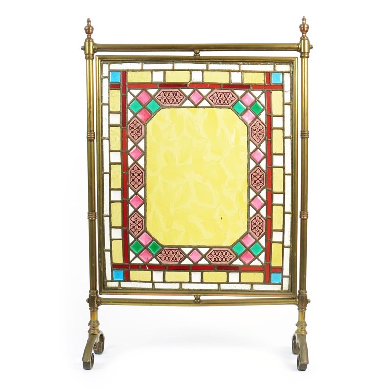 An Aesthetic Movement brass and coloured glass firescreen, the central rectangular panel with moulded amber glass vase with leaf design, inside a border of painted glass and geometric coloured glass panels, unsigned, 88cm. high, 57cm wide.