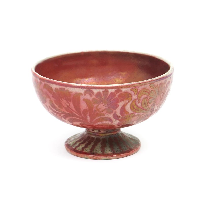 A William De Morgan small pedestal bowl, painted to the exterior with a band of carnations, in ruby lustre on a white ground, the well with radiating sun motif, unsigned, repaired foot, 15.5cm. diam.
