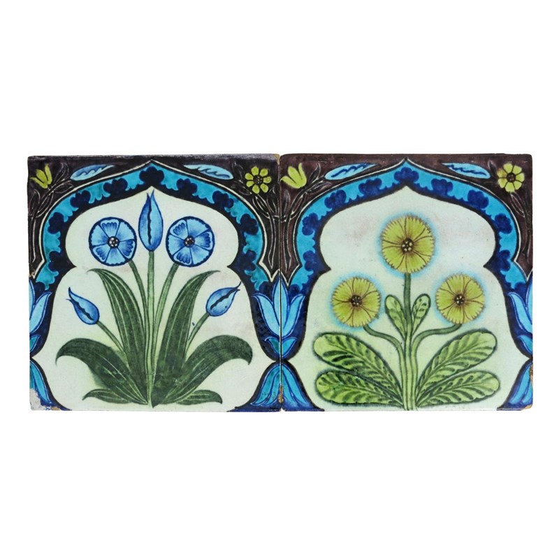 A pair of William De Morgan Sands End Pottery Arabia tiles, commissioned for the P & O Liner Arabia, painted with stylised flower stems inside Persian arch foliate panels, in shades of blue, turquoise, yellow, green and aubergine on a white ground, sold with a copy of William De Morgan Arts and Crafts Potter impressed marks, minor chips, 22.5cm. square