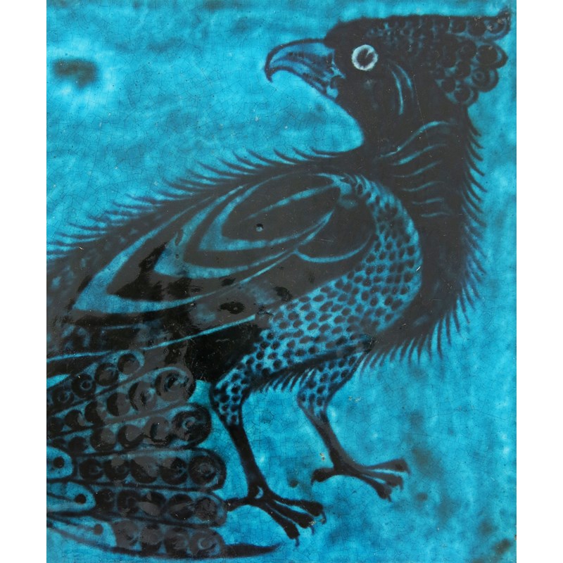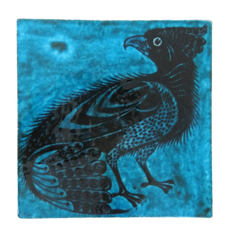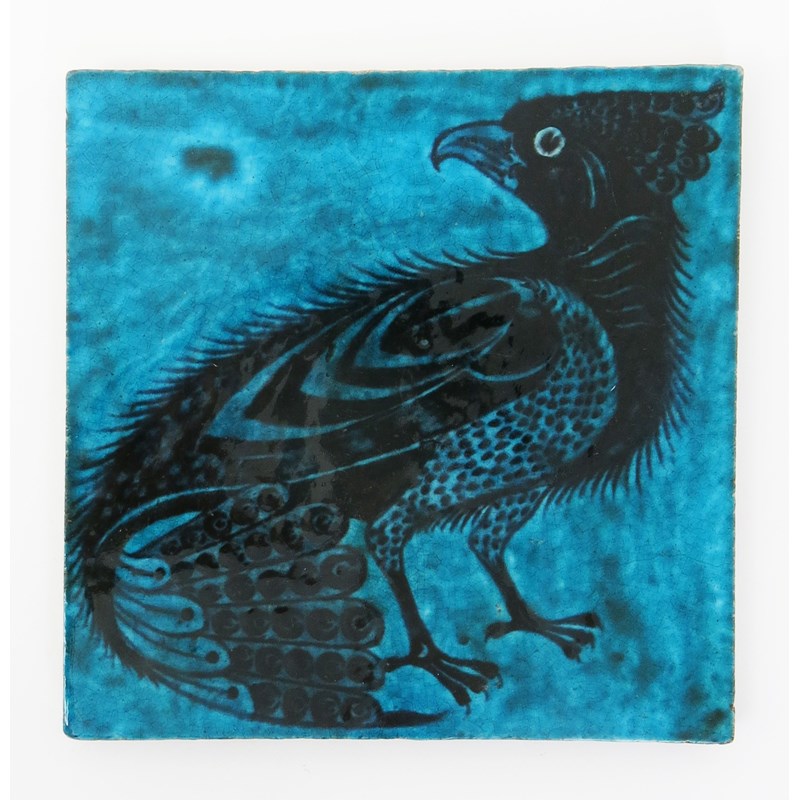 A William De Morgan Sand's End Pottery Peacock tile, painted in shades of blue on a turquoise ground, impressed seal mark, minor over-painting, 15.5cm. square