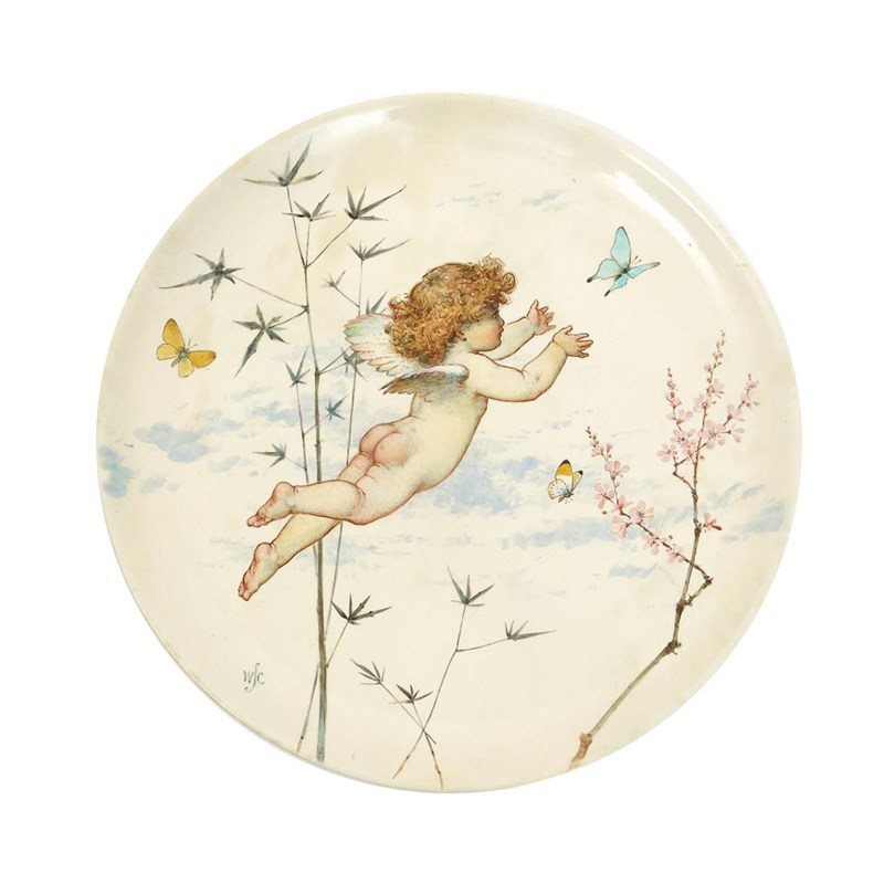 A Minton's Art Pottery wall plaque by William S Coleman, dated 1872, painted with a cherub releasing a blue butterfly, before prunus and oriental bamboo, in colours on a cream ground, impressed and printed marks to reverse, painted WSC monogram to front, painted signature and date to reverse, 34cm. diam.
