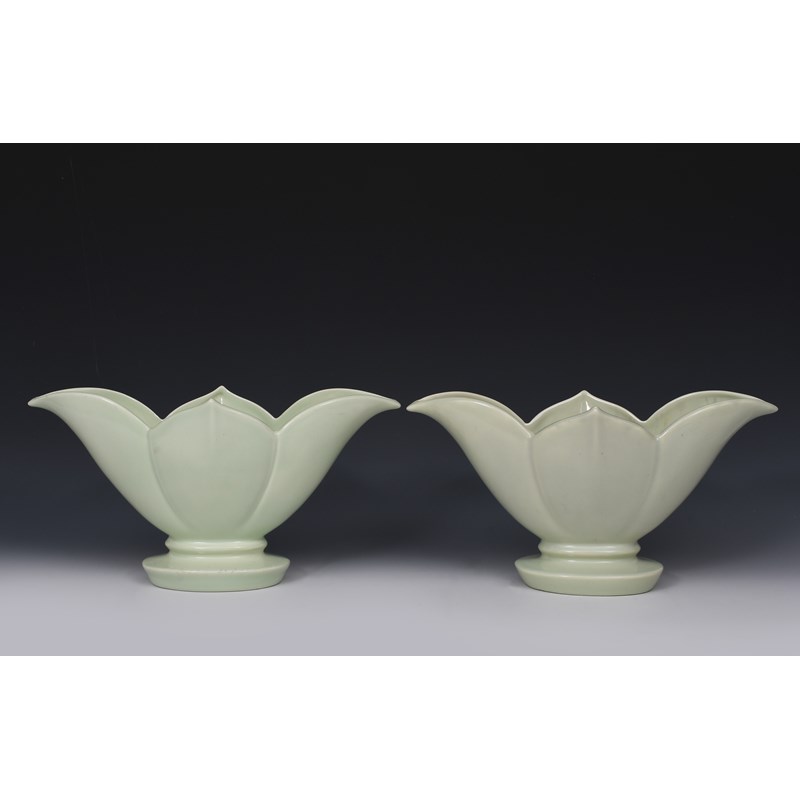 A pair of The Fulham Pottery Lotus vases designed by Charles West, covered in a mint green glaze, printed factory marks, 36cm. wide, (2)