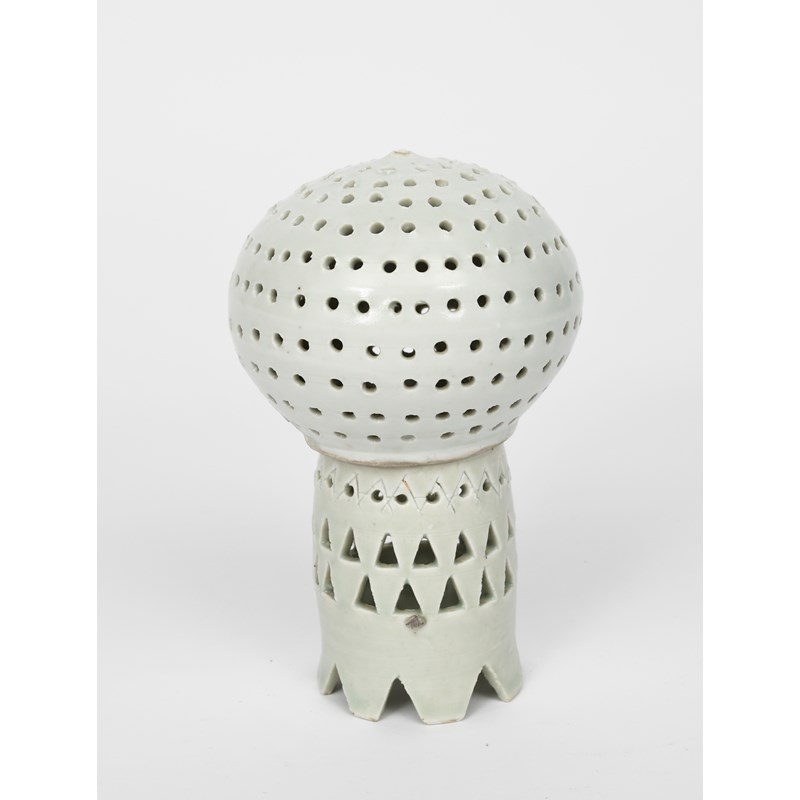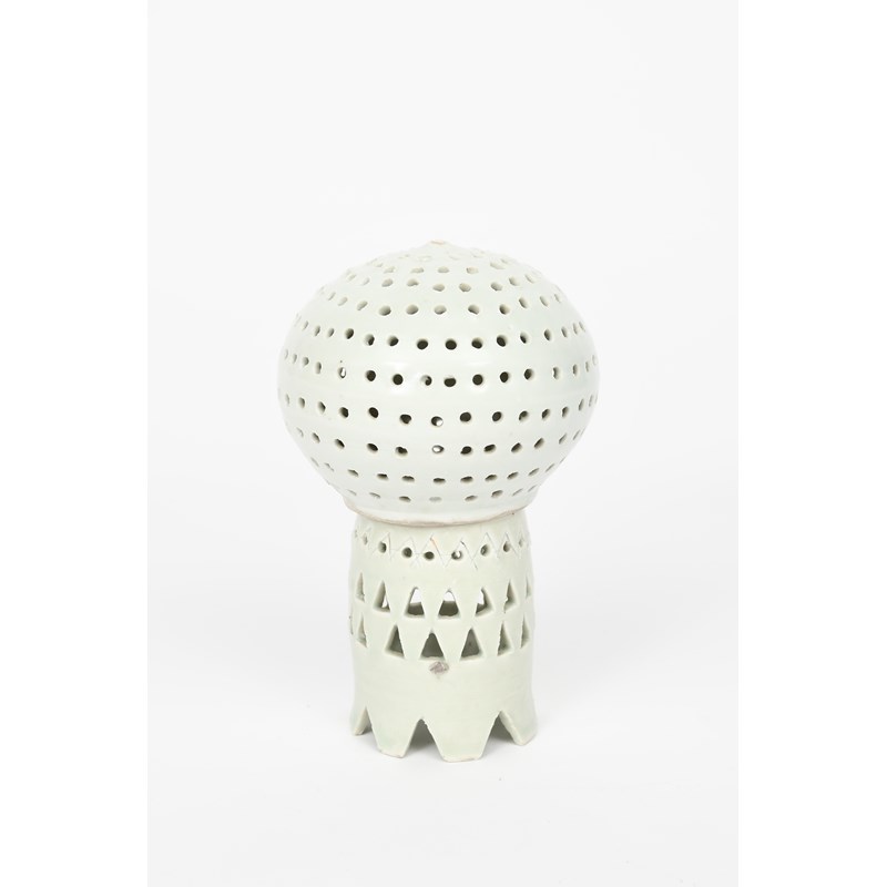 a rare early porcelain light and shade, pierced pagoda form, covered in a celadon glaze,