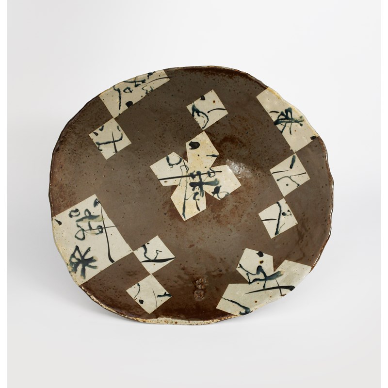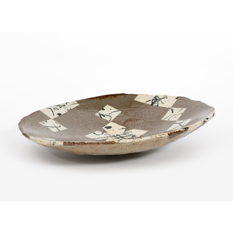 a large stoneware charger, on shallow foot, enamelled with panels in blue and rust on a speckled celadon glaze,