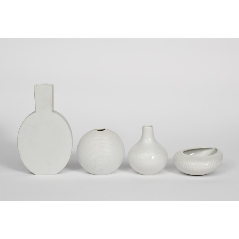 A Rosenthal Studio Line porcelain vase, ovoid with tapering cylindrical neck, cast in low relief with geometric columns, another shell form vase and two other Rosenthal Studio Line vases, printed factory marks, 12cm. high, (4)