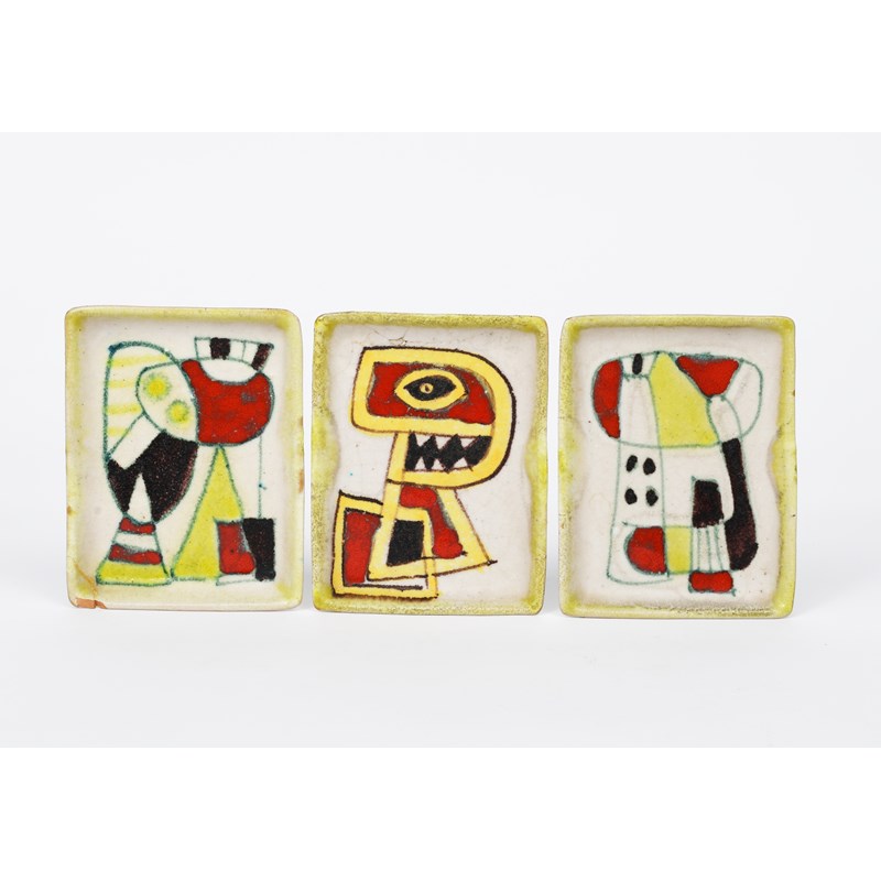 A Guido Gambone Pottery dish, rectangular form, painted with an abstract figure design in red, yellow and black on a white ground, and two other Gambone dishes similar, painted monogram, Gambone Italy, damages to two, 14 x 11cm. (3)