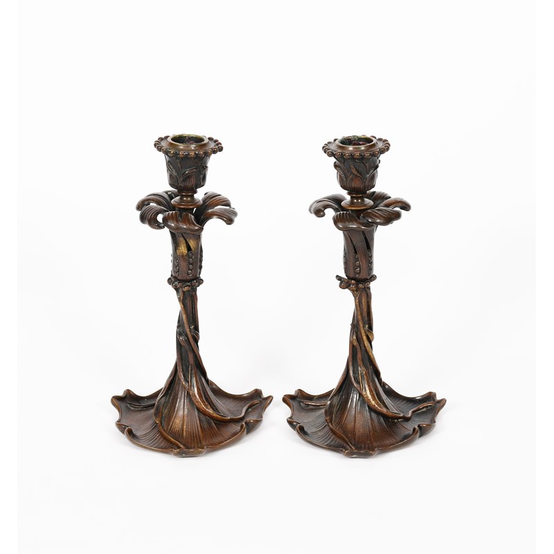 A pair of patinated bronze candlesticks possibly American, each modelled as an Art Nouveau flower stem, the bud sconce with a border of berries, unsigned, 22cm. high, (2)