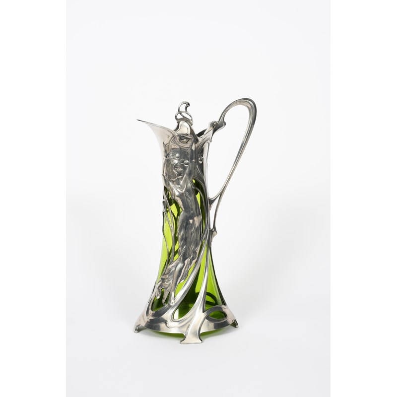 A large Art Nouveau WMF Warszawa pewter and glass claret jug, the waisted and pierced cylindrical body cast in low relief with a maiden before sinuous berried foliage stems, with hinged cover, green glass liner, stamped Warszawa marks to base rim, 37cm. high