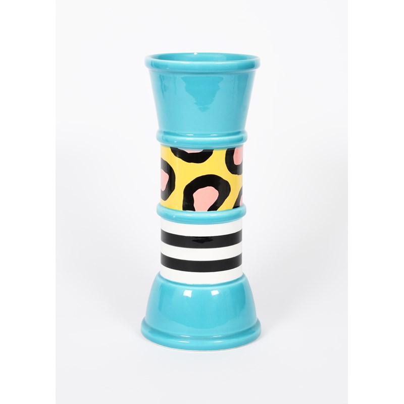 A Memphis Milano Carrot vase designed by Natalie Du Pasquier, made by Flavia, cylindrical knopped body with flaring foot and neck, turquoise with striped and patterned bands printed factory marks, 30cm. high