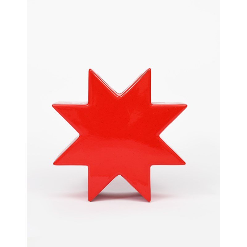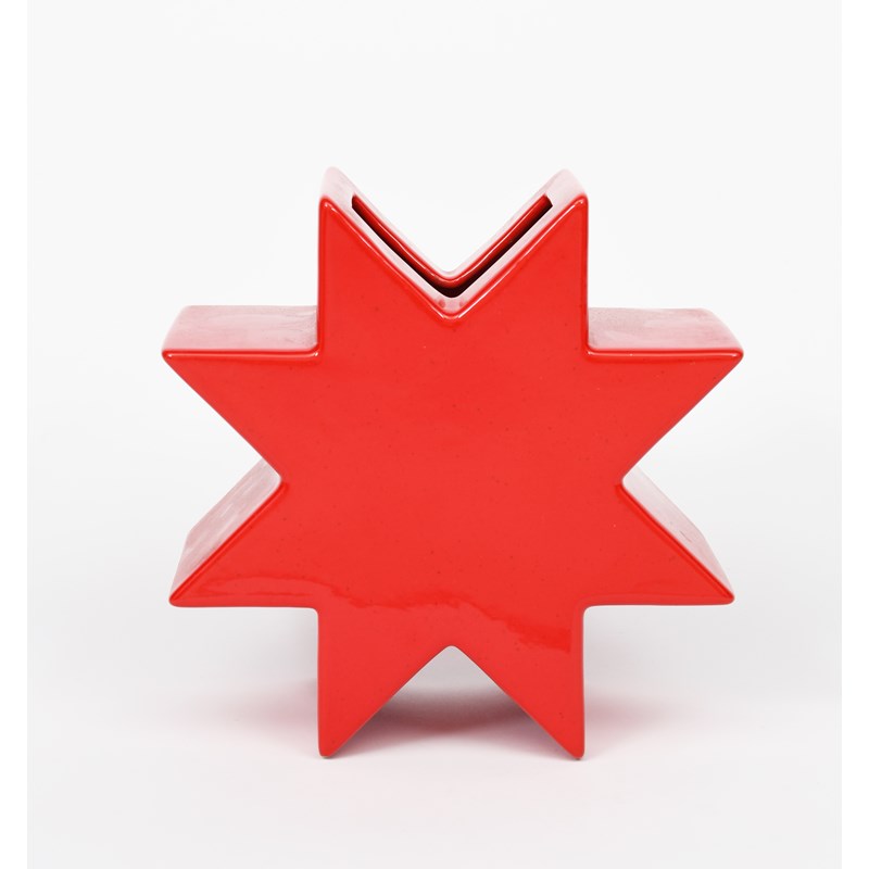 Hsing Star vase designed by Ettore Sottsass for Anthologie Quartett, red enamelled ceramic vase, painted and printed marks, no.323, 17.5cm. high