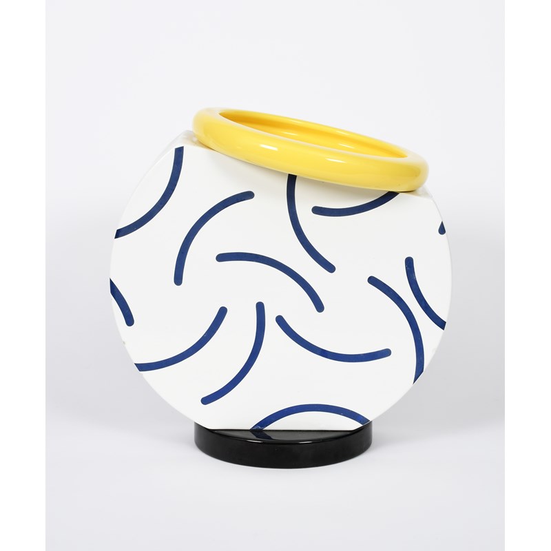 A Memphis Milano Pottery Cucumber vase designed by Martine Bedin, designed 1985, made by A Sarri Ceramiche, the cut circular body on black disc foot, decorated with curved blue lines on white, with bright yellow circular rim, printed factory marks, 31cm. high