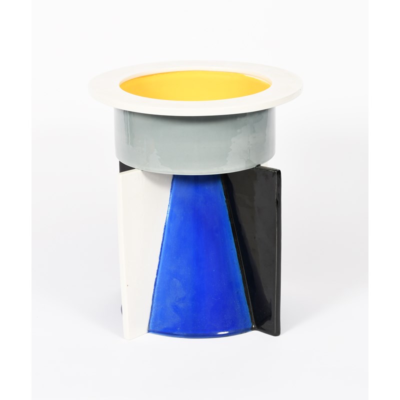 A Memphis Giotto vase designed by Johanna Grawunder, 1991, tapering blue conical body with four white and black flanges, supporting grey bowl with white rim and yellow interior unsigned, 27cm. high