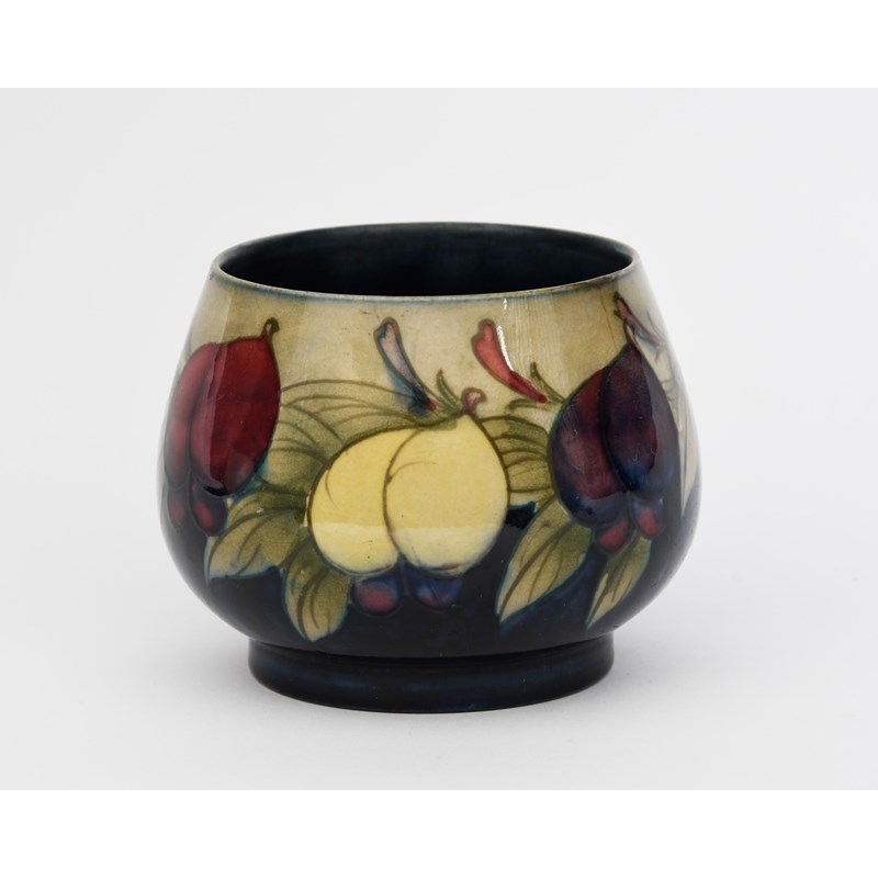 'Flambe Leaf and Blackberry' a Moorcroft Pottery plate designed by William Moorcroft, tubeline decorated and painted in colours under a flambe glaze, and a Moorcroft Pottery Wisteria pattern pot, impressed marks, painted blue signature, 22cm. diam. (2)