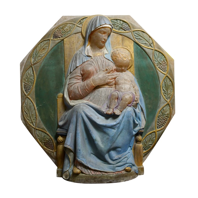 'Mother and Child' a large painted alabaster panel, unsigned, 88cm. wide