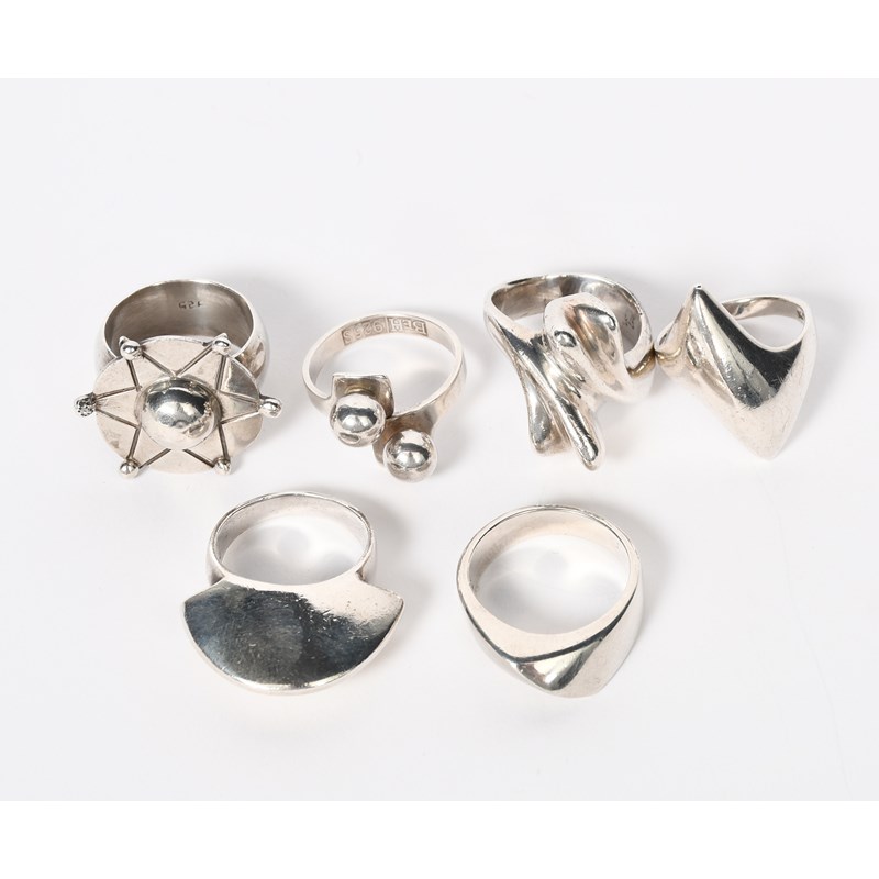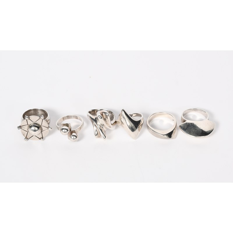 A Norwegian silver ring, cast loop band set with two ball panels, another ring with solid crescent form, and four other rings main marked BEH 925 S, (6)