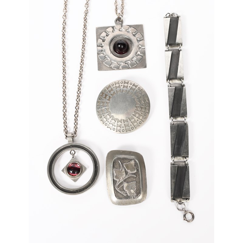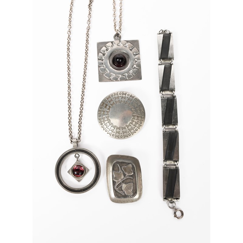 A Wege Tenn pewter pendant necklace, circular with central pink glass drop, a Logeskov pewter bracelet, a Tyr pewter pendant necklace and two brooches stamped marks, 5cm drop, (5)