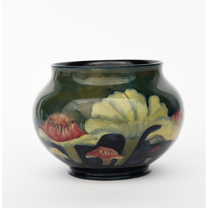 'Claremont' a Moorcroft Pottery jardiniere by William Moorcroft, dated 1920, swollen form, painted in colours on a green ground, painted green signature and date 1920, hairline to foot rim, 18cm. high
