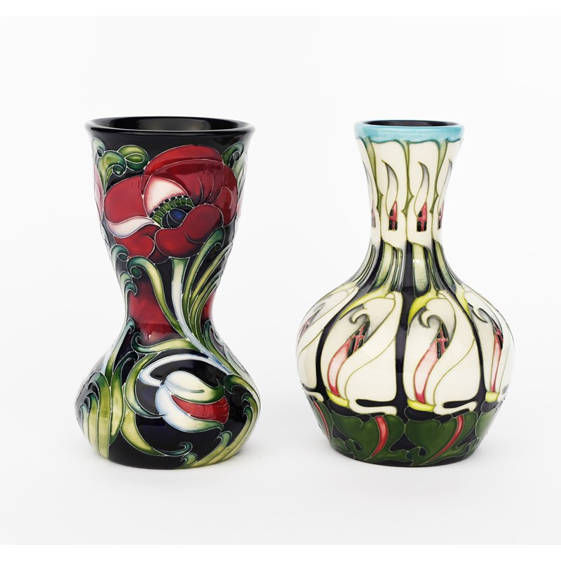 'Lily Come Home' a Moorcroft Pottery vase designed by Emma Bossons, dated 2008, painted with lilys in colours, and another Moorcroft Pottery vase painted marks, 18.5cm. high, (2)