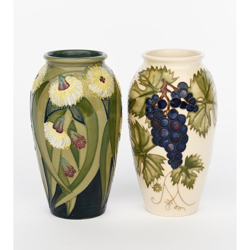 'Gum' a Moorcroft Pottery vase designed by Sally Tuffin, painted in colours, and a 'Grape vine' Moorcroft Pottery vase painted marks, 260/500, 18.5cm. high (2)
