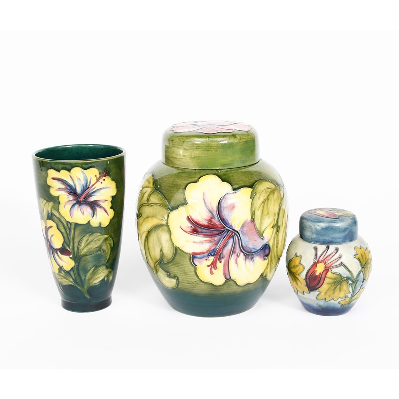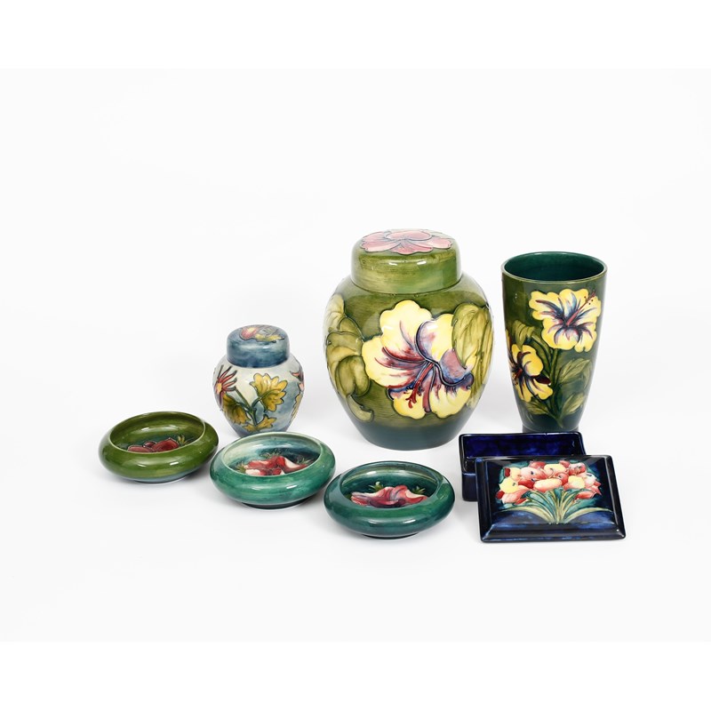 'Hibiscus' a large Moorcroft ginger jar and cover, painted in colours on a green ground, a vase in the same pattern, a springflowers box and cover, a small Aquilegia ginger jar and cover and three dishes,