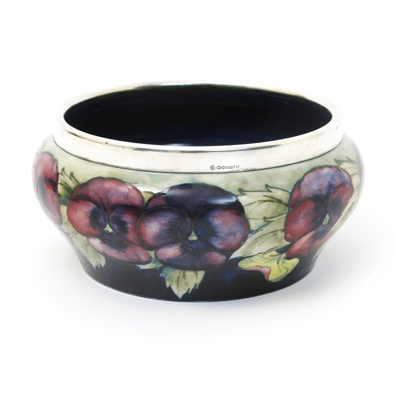 'Pansy' a Moorcroft Pottery bowl designed by William Moorcroft, with electroplated rim, painted in shades of purple, blue and green impressed marks, painted green signature, 21cm. diam.