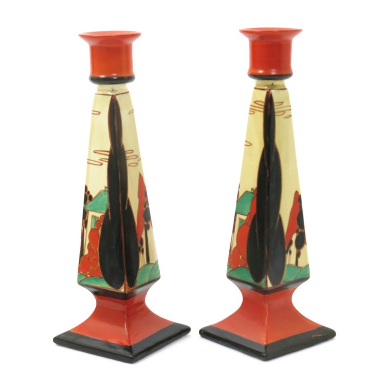 'Red Trees and House' a pair of Clarice Cliff Fantasque Bizarre Elton candlesticks