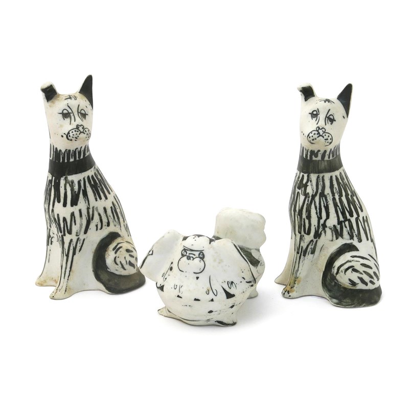 A Richard Parkinson Pottery model of a Peke designed by Susan Parkinson, painted in blue-black, and two Parkinson Pottery seated dogs impressed marks, 8cm. long (Peke) (3)