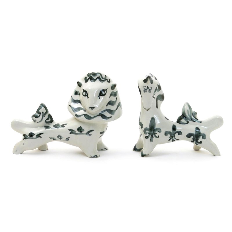 A pair of Richard Parkinson Lion and Unicorn figures designed by Susan Parkinson, painted in blue, unmarked, chips to feet, 22.5cm. wide (2)