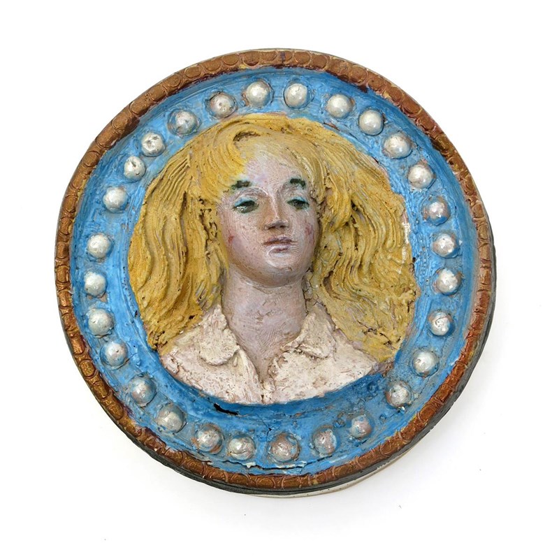 a Fulham Pottery plaque, modelled in relief with a portrait of a lady with flowing blonde hair, in colours highlighted in gilt, mounted on board, impressed bell monogram and factory marks 23cm. diam.