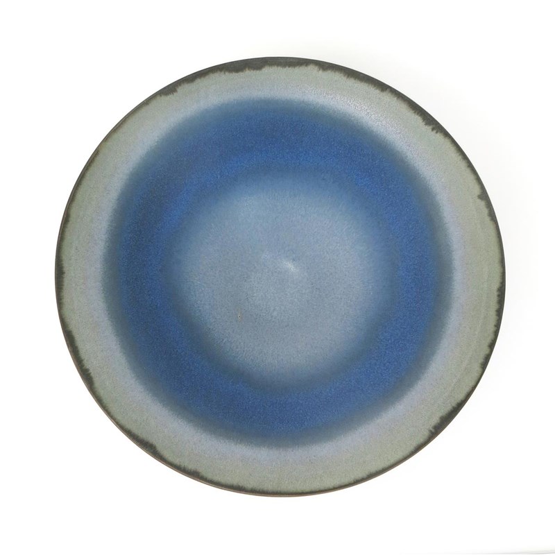 a large flaring porcelain footed bowl, covered in a blue and grey hare's fur glaze, with bronzed rim, impressed seal mark, 34cm. diam. 15cm. high