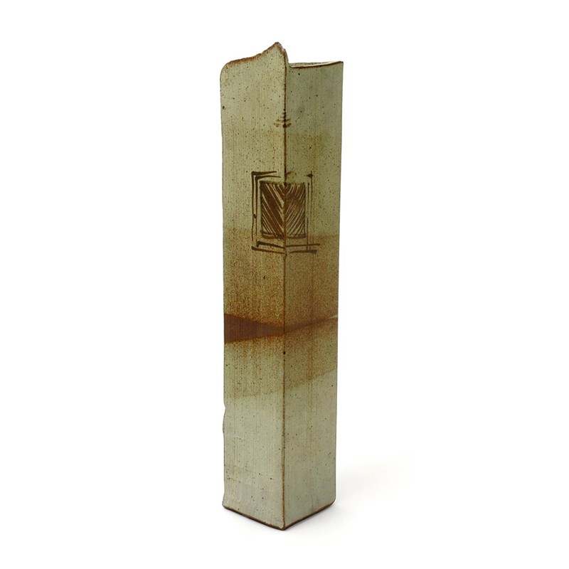 a stoneware vase, 1972, square section with irregular top rim, painted with panels in iron oxide on an oatmeal ground impressed monogram and date, sold with a letter from the potter, 52cm. high