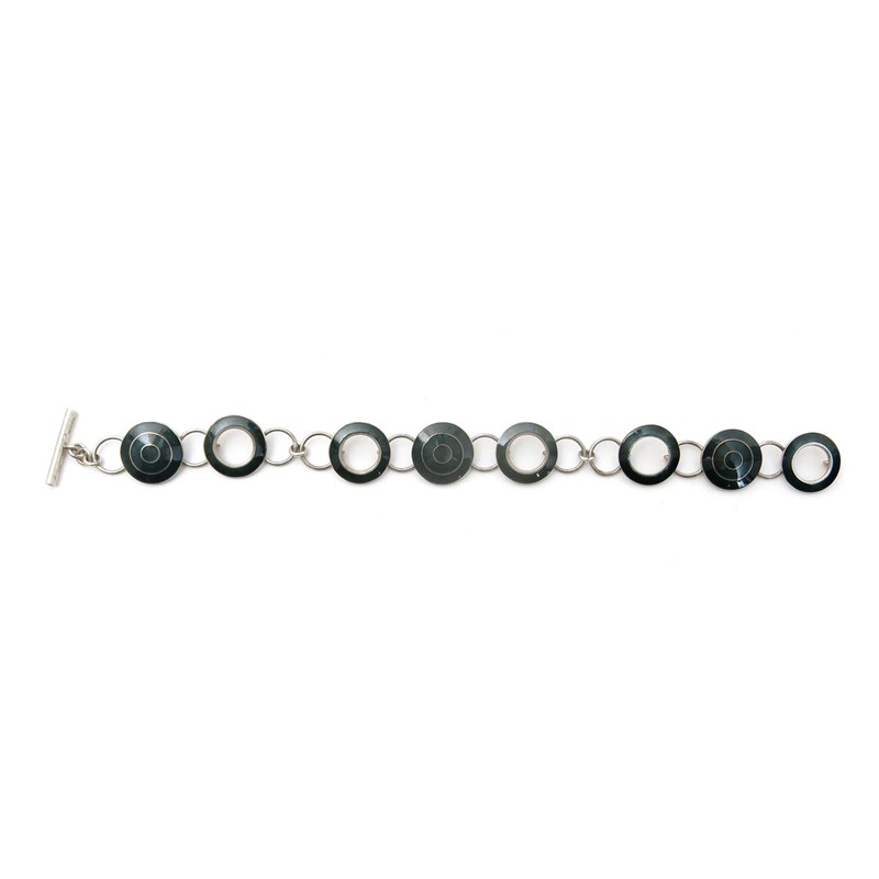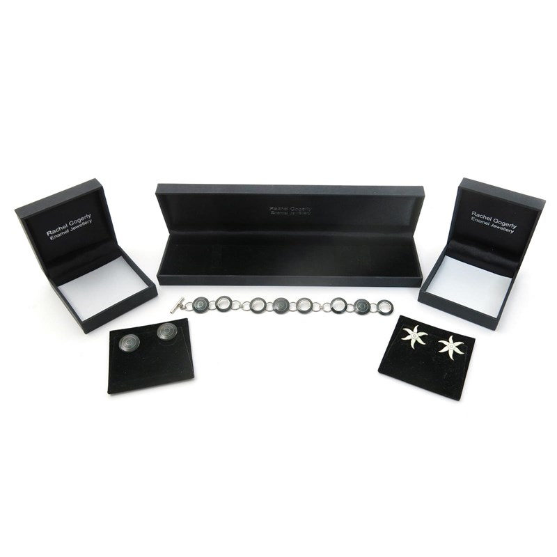 A Rachel Gogerly enamelled silver link bracelet, circles of green enamel with circular links, a pair of en suite earrings and another pair of Rachel Gogerly enamelled earrings modelled as star flowers, all in fitted presentation cases, cases signed, 18cm. wide (bracelet), (3)