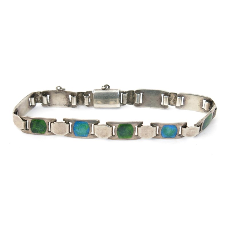 A James Fenton silver and enamel link bracelet, each rectangular panel with blue and green enamel decoration, stamped marks, Birmingham 1908, 16cm long.