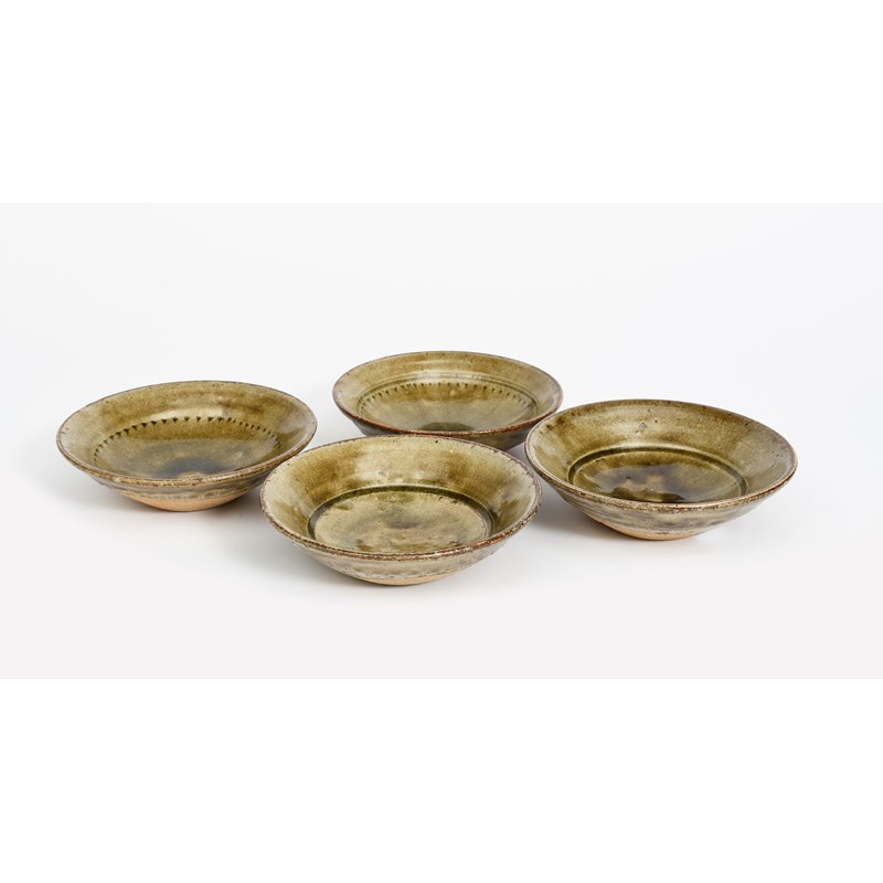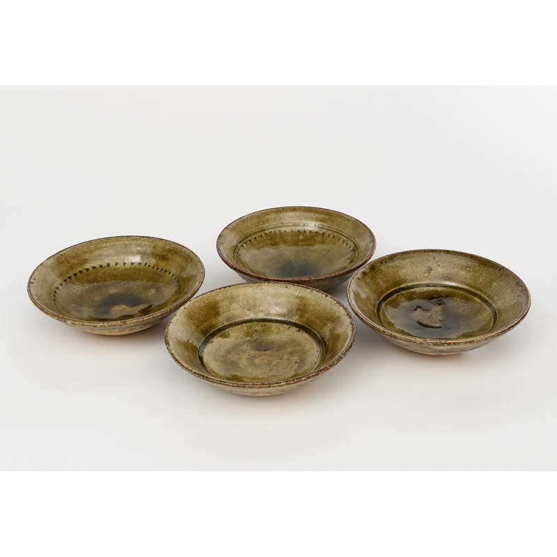 a set of four stoneware dishes, two with chatter bands to interior, covered in an ash glaze,