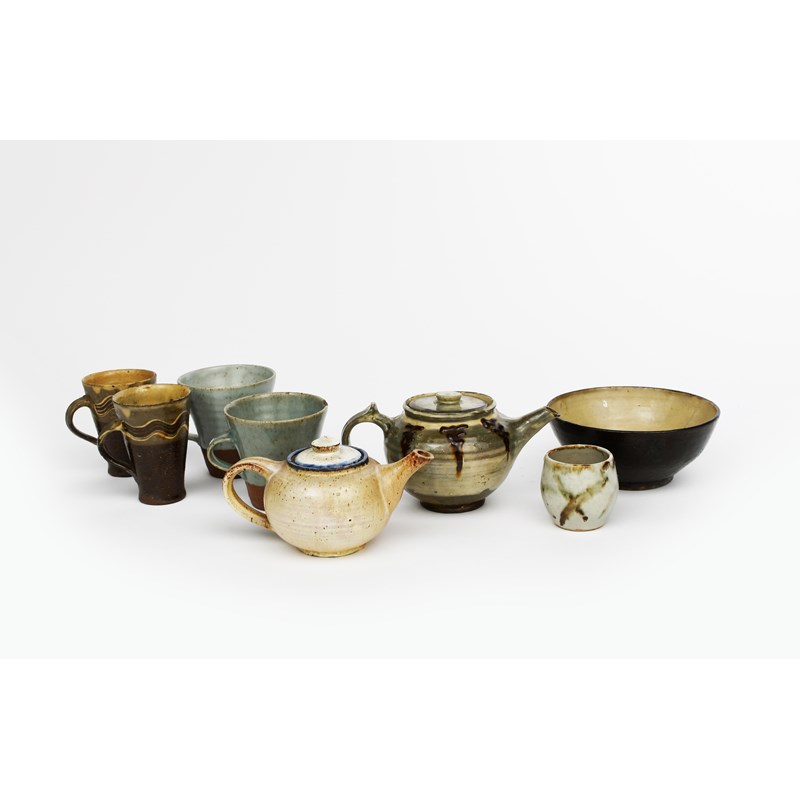 an early pottery teapot and cover, probably made at Bryanston, slip decorated on a blue-grey ground, another smaller teapot and cover dated 1950, and a collection of early pottery by Richard Batterham,