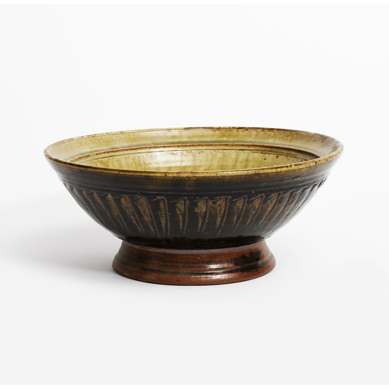 a large cut-sided stoneware tazza, glazed ash to interior, the exterior black iron,
