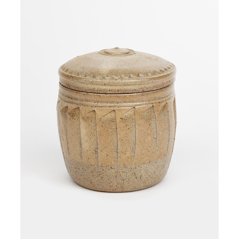a salt-glaze cut-sided stoneware tea caddy and cover, the cover with chatter band to the rim, glazed ash to interior,