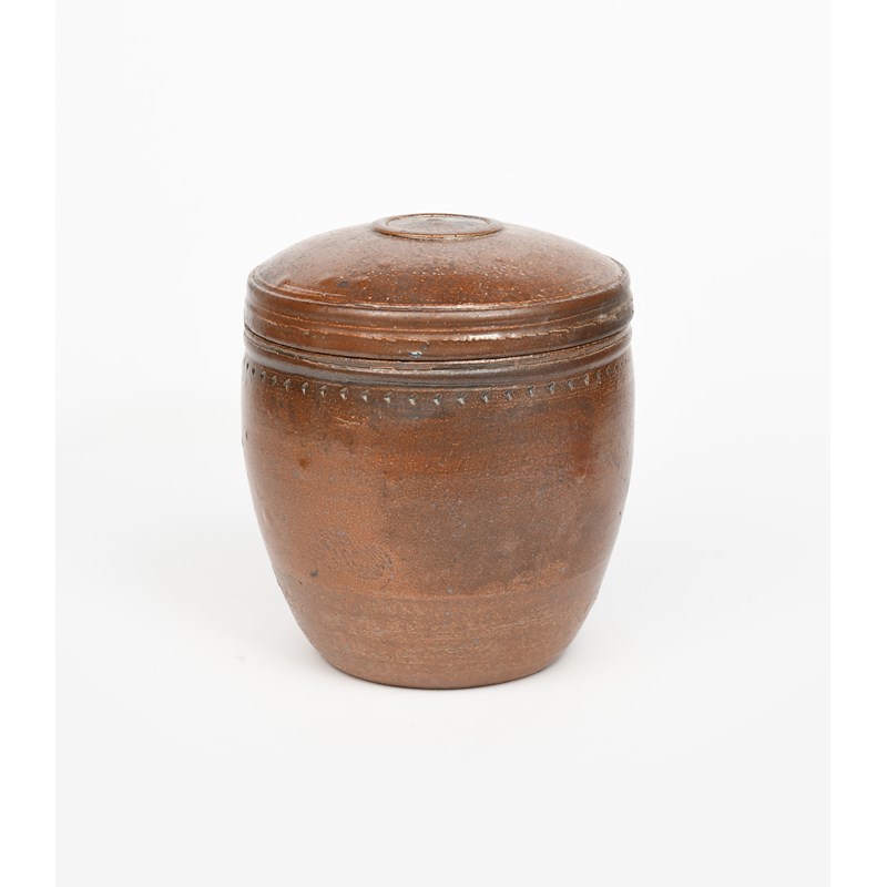 a large salt-glaze caddy and cover with chatter band, covered to the foot with a brown ash salt-glaze