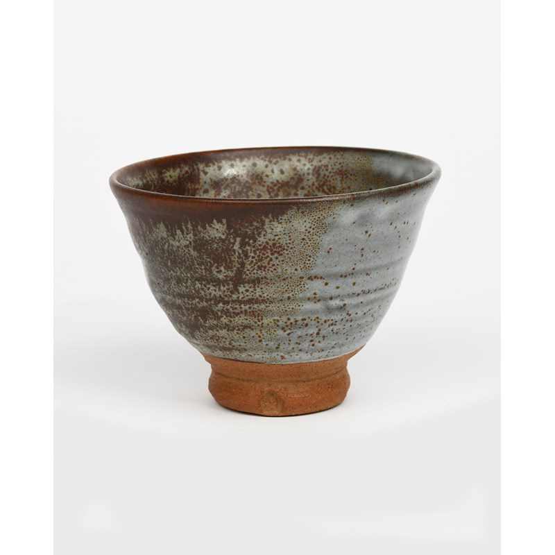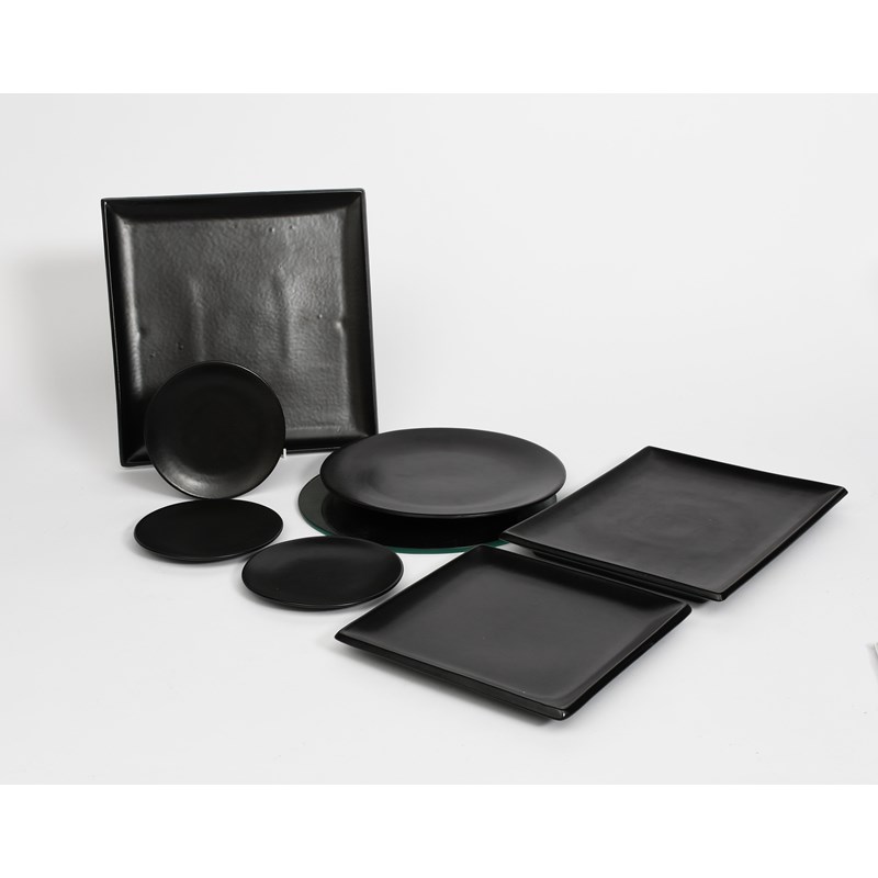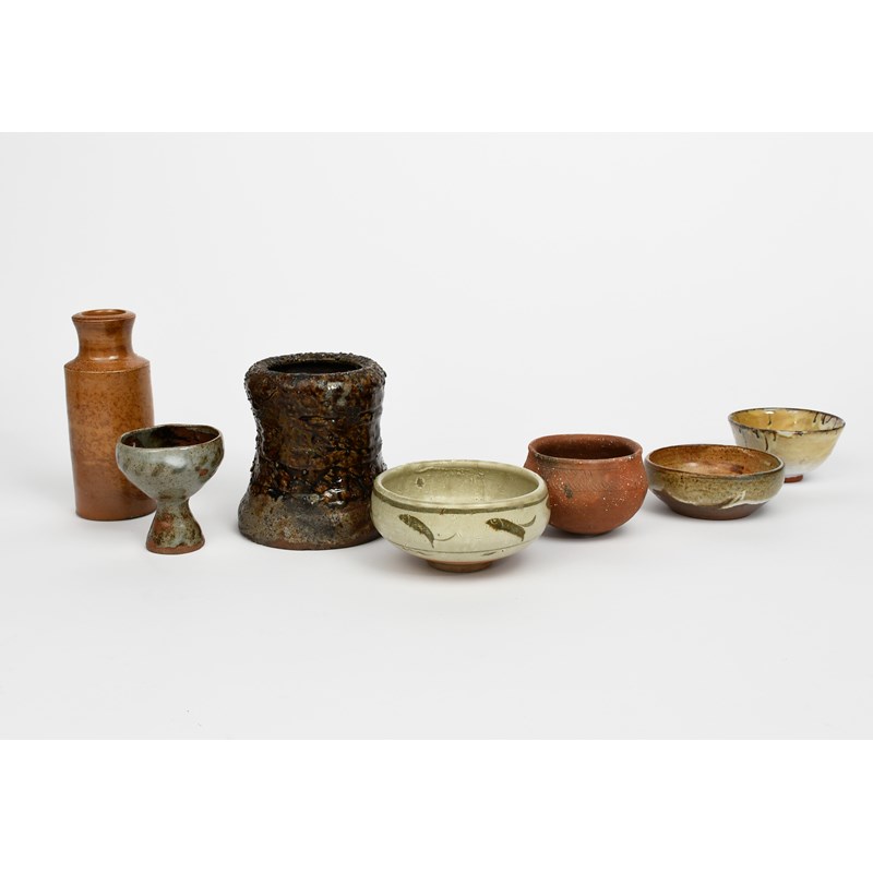 a stoneware footed bowl, flaring conical form, covered in a speckled grey and rust glaze to the foot, a stoneware bowl in the manner of Bernard Leach painted with cobalt fish, nine studio pots and a part service by Honiton designed by Maryse Boxer glazed matt black, comprising three square plates, one large circular plate and three side plates with a circular mirror display, impressed pentagon seal mark, 16cm. diam. (19)
