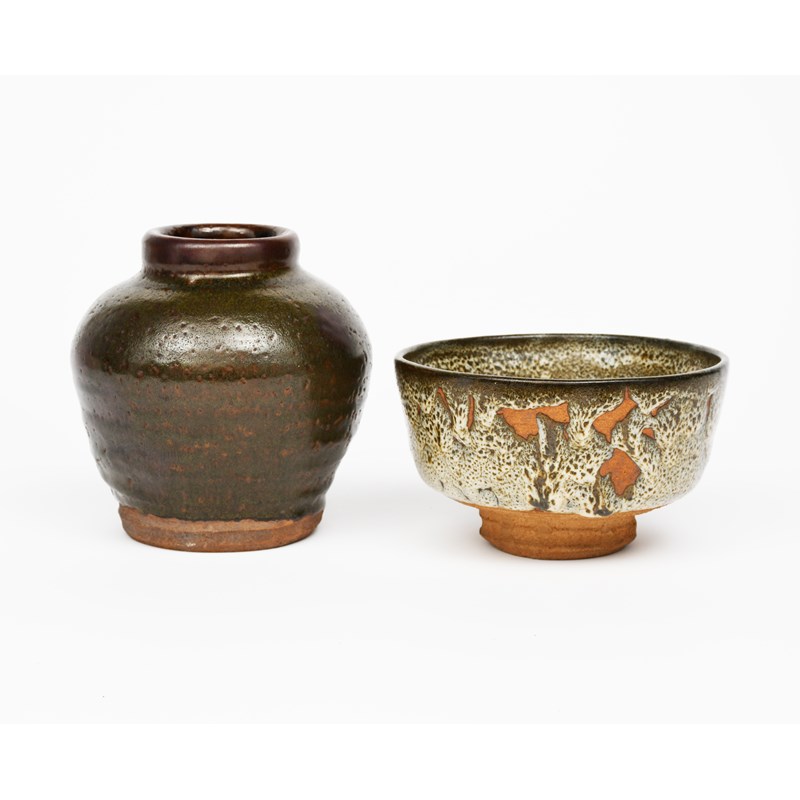 a stoneware footed bowl, covered to the foot with a running mushroom and white speckled glaze, and a stoneware vase by William Staite Murray covered in a rust glaze to the foot