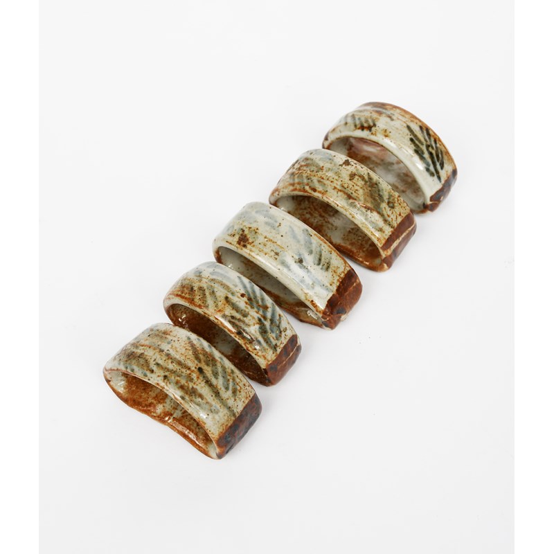 five serviette rings, each painted with simple leaf design, in cobalt blue on ash,