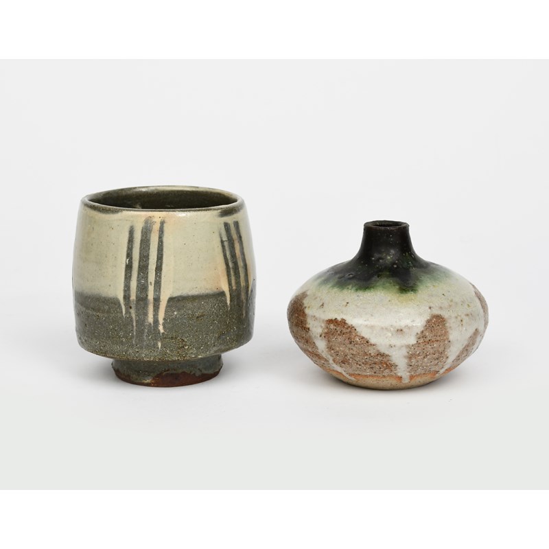 a stoneware unomi, covered to the foot with a grey glaze, under white slip with combed design, and a solifleur vase by Eric James Mellon
