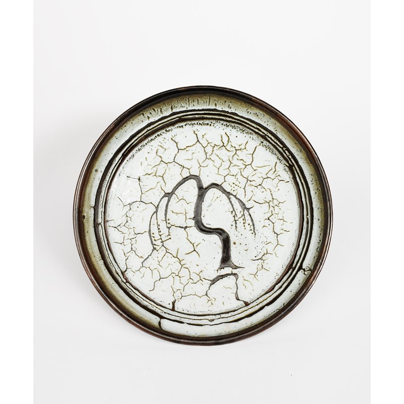 a Lowerdown Pottery Willow pattern stoneware charger, decorated in resist in Dolomite over a tenmoku glaze,
