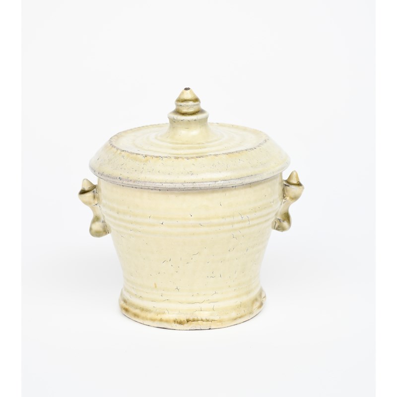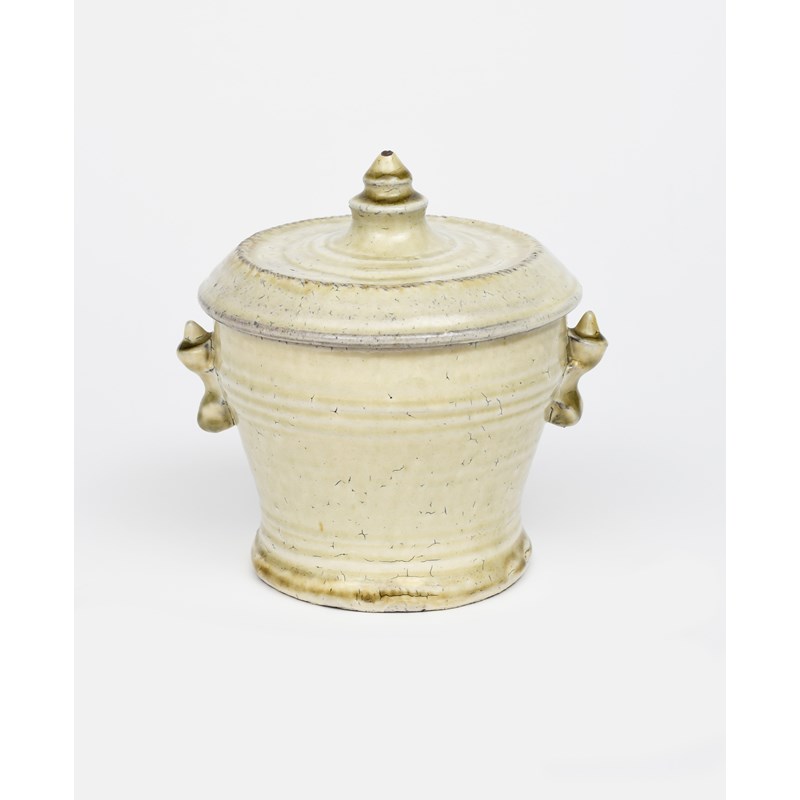 a stoneware vase and cover, twin-handled, waisted form, covered in a splitting cream ash glaze,