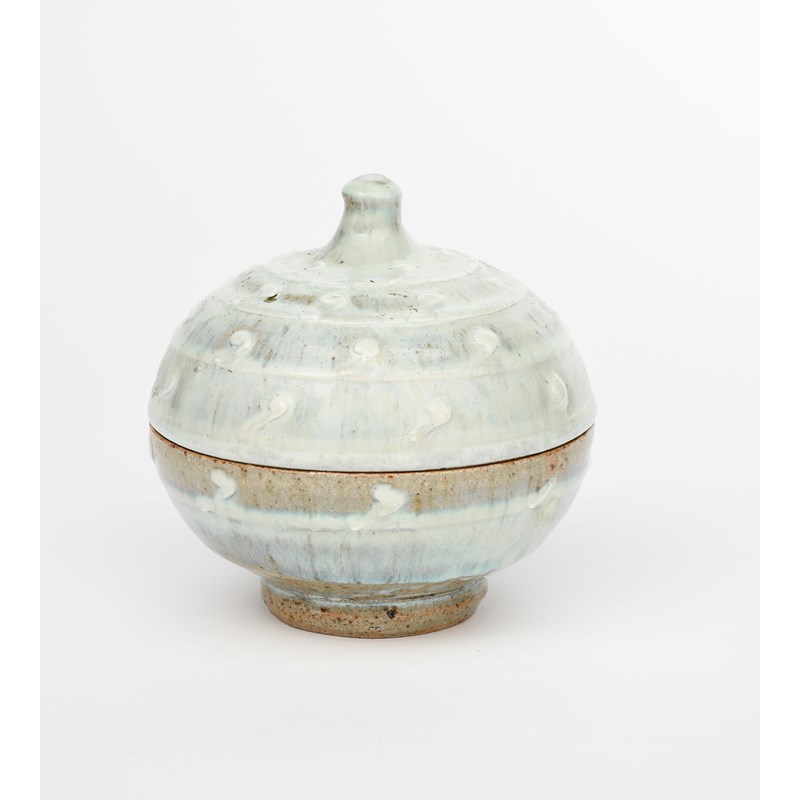 a stoneware pot and cover, footed, circular section, slip decorated on a speckled oatmeal ground, under translucent off-white glaze,