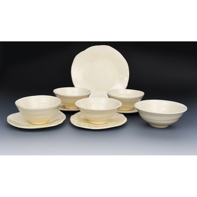 a creamware composite part service, covered in a pale honey glaze, comprising, five various bowls, four side plates and five dinner plates, some with slip decoration,
