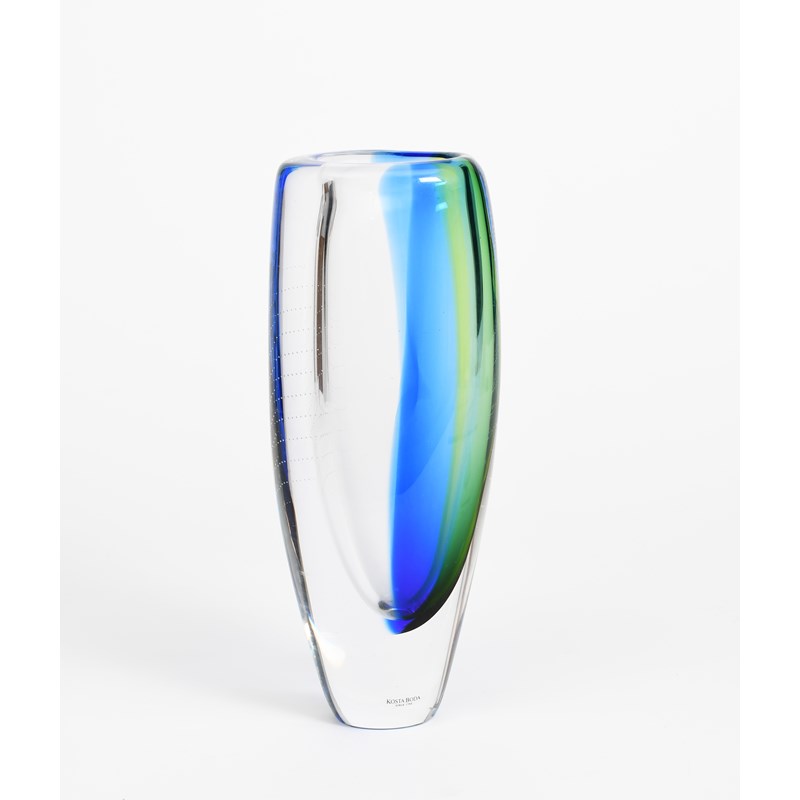 A Kosta Boda glass vase by Goran Warff, slender, swollen cylindrical form, blue and green striped